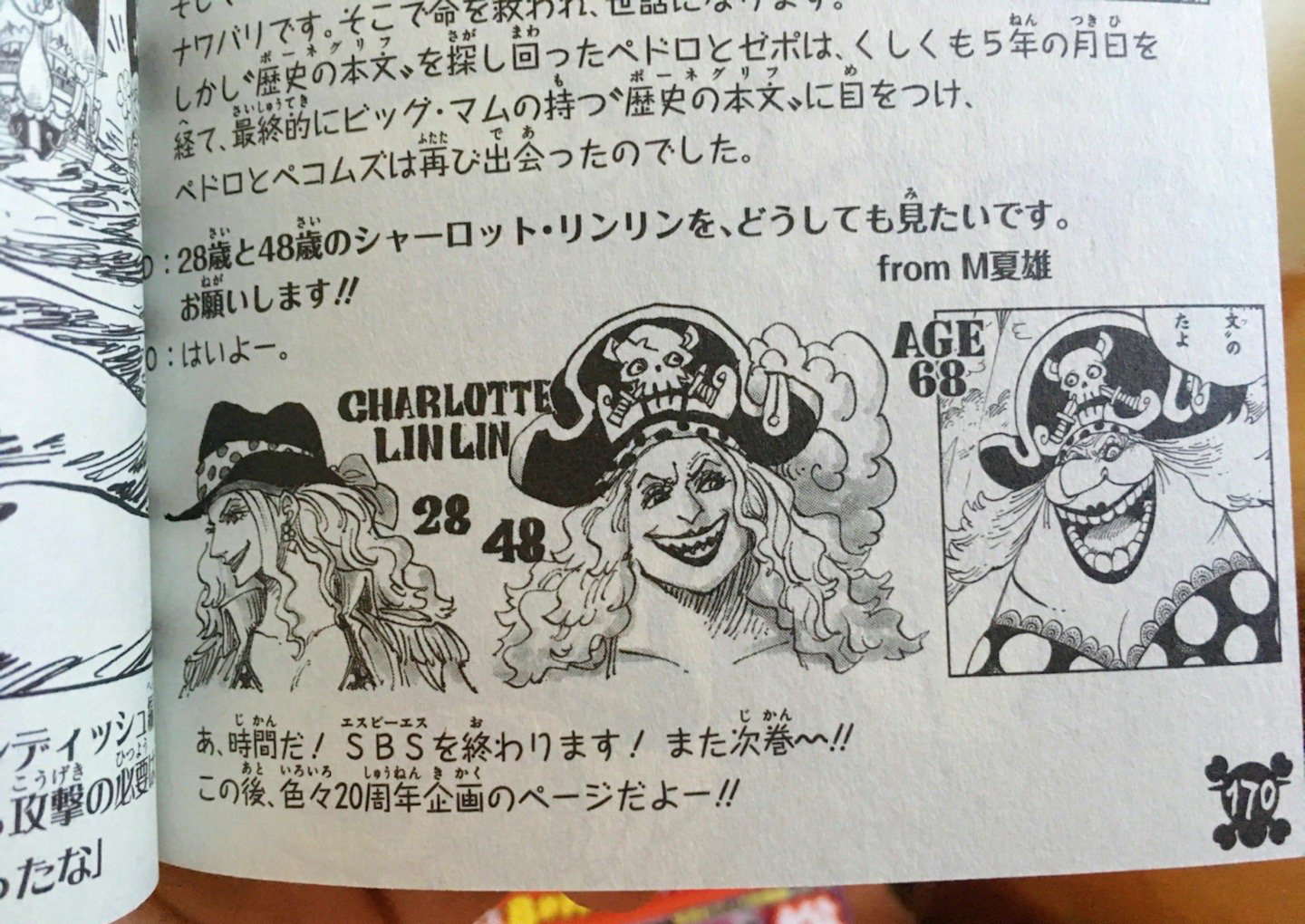 在最新漫畫情報中,凱多通過回憶告訴海米他與大媽的首次碰面,那年凱多15歲,而大媽已經算是獨當一面的海賊了,並且揚言要成為“大海之王的女人”。眾所周知,大媽比凱多年長9歲,所以當時的大媽應該是24歲。而尾田曾在SBS問答中繪制出大媽28歲的模樣,因此基本可以斷定大媽24歲的模樣就是一位女神級別的。