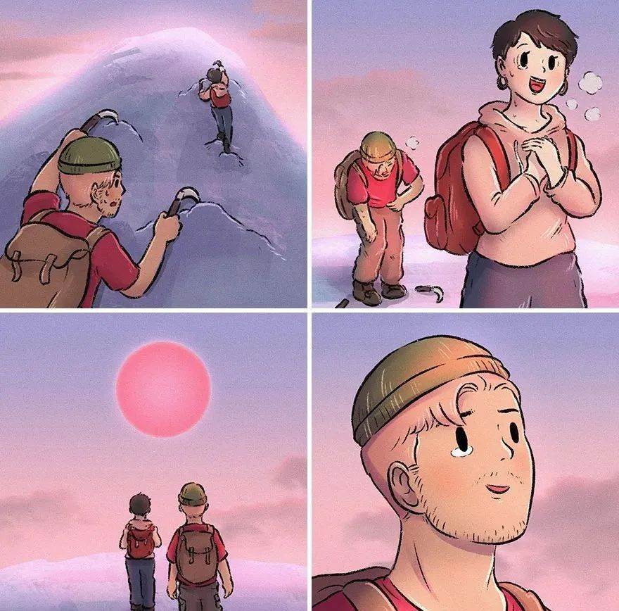 終於,他們歷經千難萬險,爬到了山頂,看到美麗的落日。