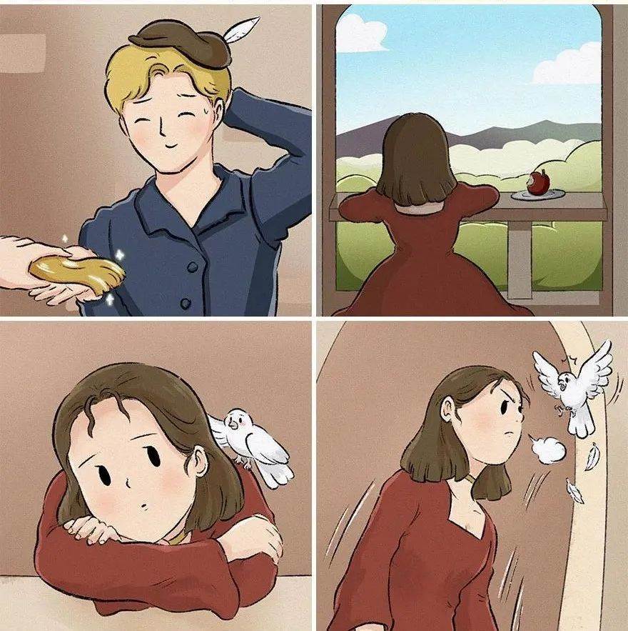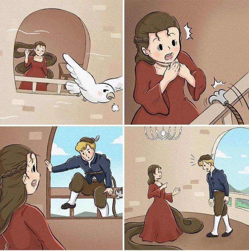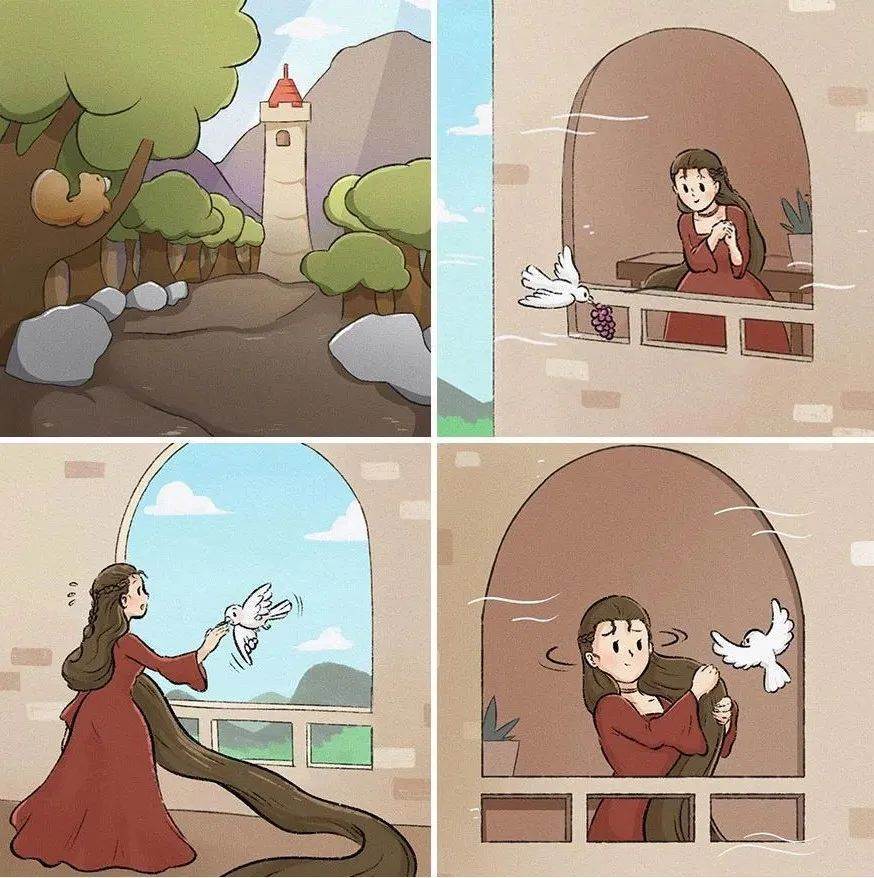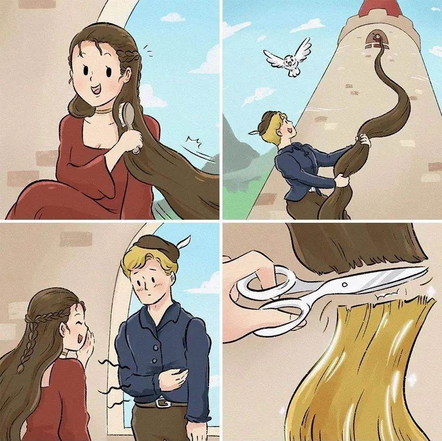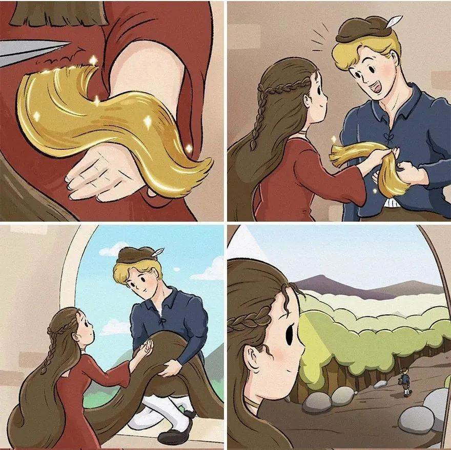 結束:擦乾眼淚后,長發公主頭也不回的走掉了,在這個漫畫中,長發公主的長發就像是她的心,而遠處的高塔,就像是她障礙,男孩騙走了她的心,卻讓她有勇氣打破阻礙,去迎接新的生活。
