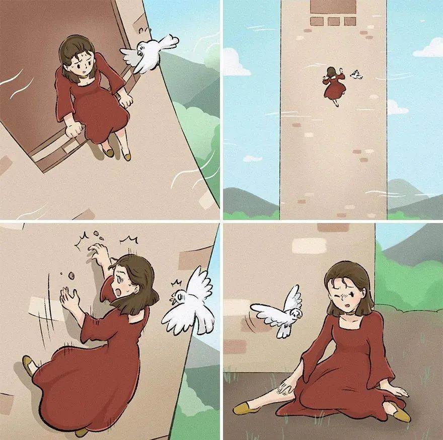 這時候,鴿子告訴長發公主,那個男孩不會來再來,長發公主不相信,於是跳下堡壘去尋找男孩。