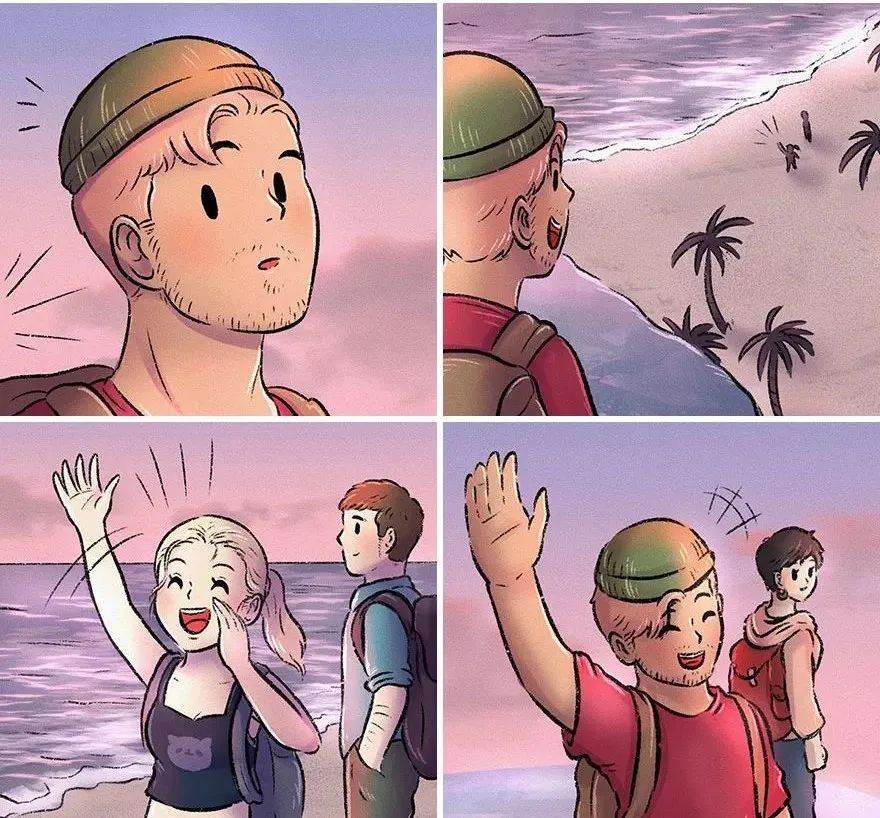 這時候,在山下的海灘上,一同旅行過的女孩正在和他打招呼,不過,她的旁邊也有了一個男孩。