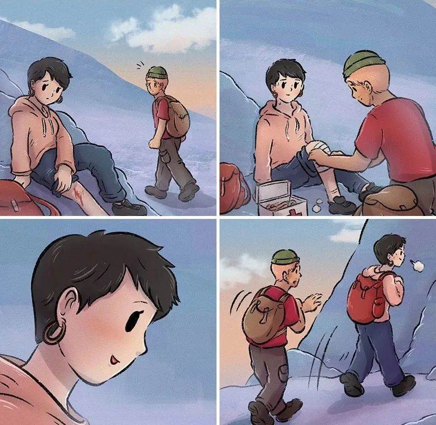 一個男孩去野外冒險,在爬坡的時候遇到了困難,突然伸出一隻手來幫助他。