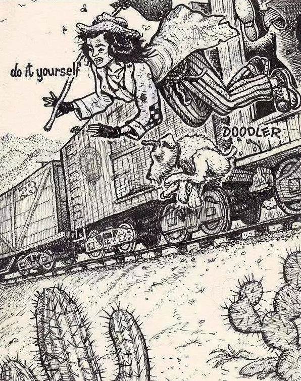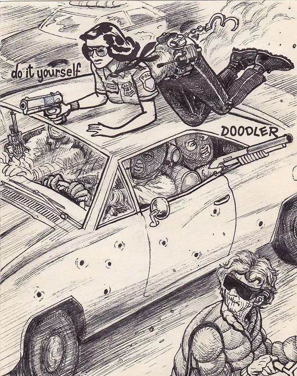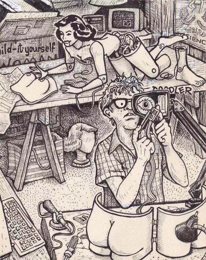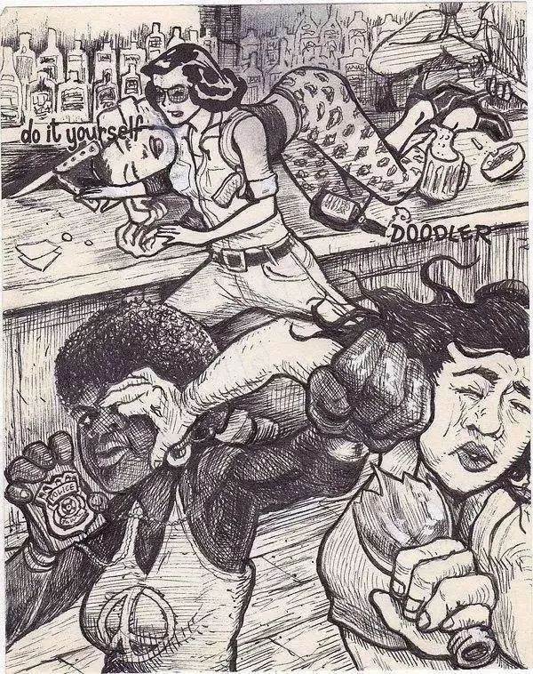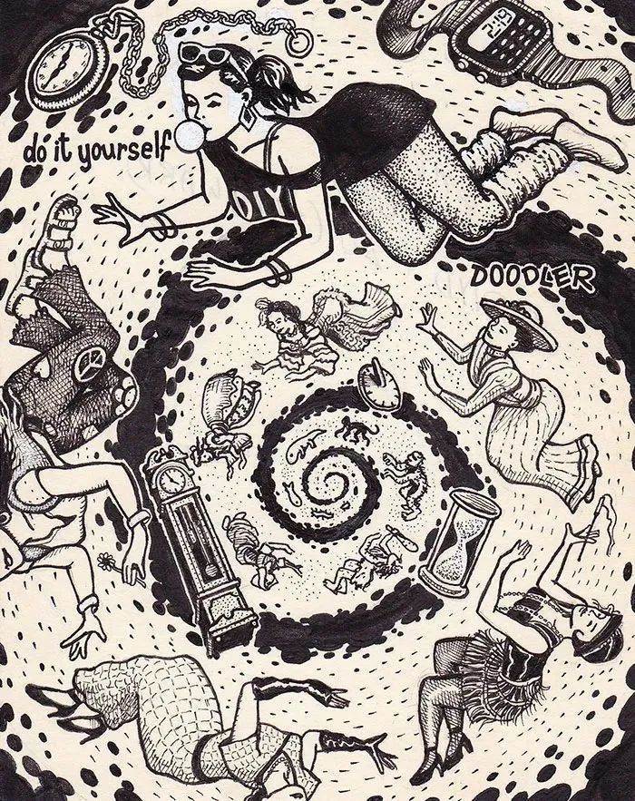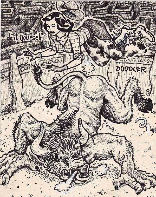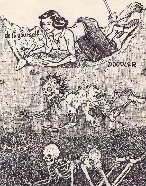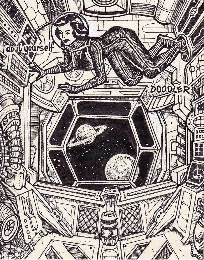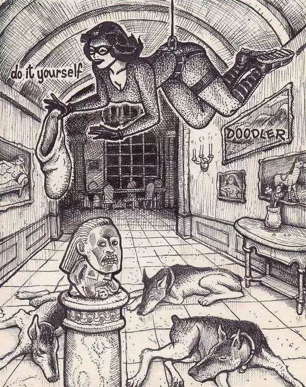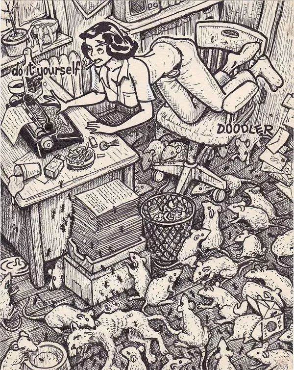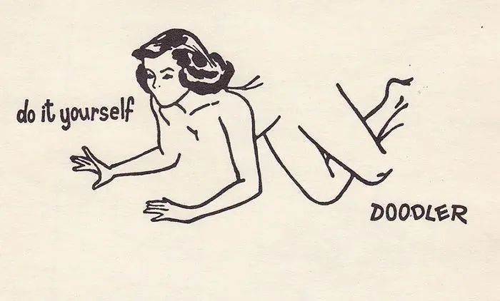 一本60年代的漫畫練習本裡面是一道補畫練習,空白頁上印的都是一個趴著的大致身體輪廓的女子,旁邊寫著 do it yourself Doodler (請補充完整)。