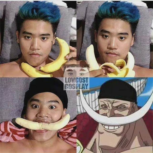 如果想要cos白鬍子的話,那麼需要準備的東西就簡單多了,泰國小哥直接一根香蕉和兩條毛巾就輕松搞定了。最後香蕉變成了白鬍子的鬍子,兩條毛巾一條成為了頭巾,一條成為了衣服的領子,不得不說泰國小哥的這波操作實屬靈性。