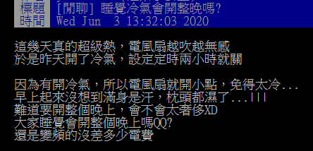 原po表示,近期天氣炎熱,睡覺時必須開冷氣,他通常會設置定時兩到三小時,待房間涼爽後或入睡後便關掉,以節約能源和減少電費支出。然而,他也好奇是否有人會整晚開冷氣不關。