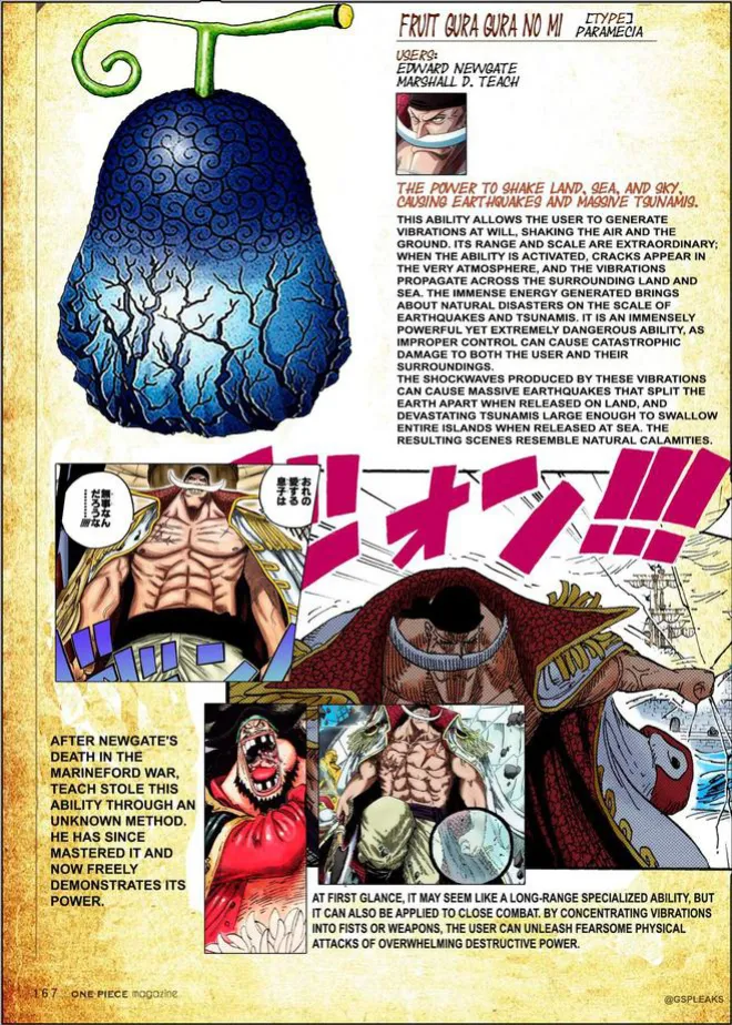 震震果實極其強大,足以毀滅世界!而尾田還是對它進行了削弱,不將它歸類是自然系,成為超人系!但也是超人系中最強大的存在!如今震震果實被黑鬍子所得,加上自然系暗暗果實,黑鬍子非常棘手,路飛又要如何才能擊敗他呢!?
