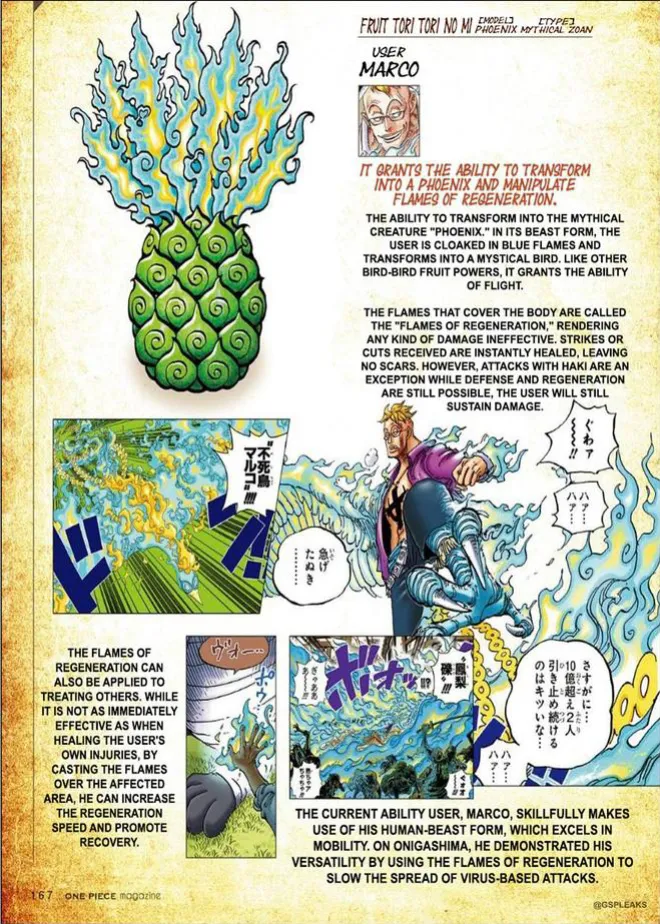 當前能力使用者馬爾科,巧妙運用了其以機動性見長的人獸形態。在鬼之島上,他展現了多面才能,通過再生之火延緩了病毒攻擊的蔓延速度。