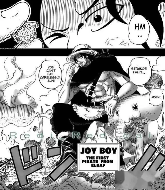 所以在伊姆的閃回里,出現了年輕時期的喬伊波伊,此時的他撿到了一顆惡魔果實,而它正是【動物系人人果實幻獸種尼卡形態】,後面喬伊波伊也是將其吃了下去,才發現那是一種能力!