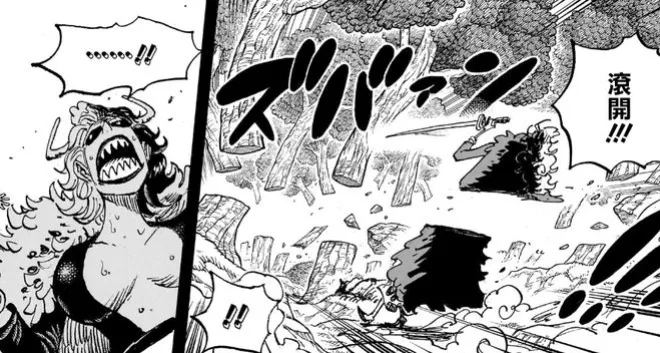 於是卡普直接一波橫掃!蘊含霸王色霸氣的一刀將這位尖牙女子直接腰斬,瞬間砍掉了一大片樹木,可以讓卡普等人看清眼前的事物和更快的趕往目的地。