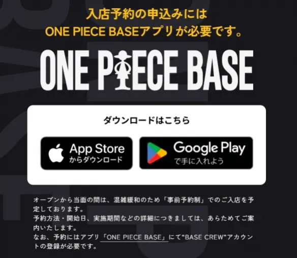 為避免開幕期間人潮擁擠,目前官方開放抽選預約入店時段。是否開放現場排隊入場尚未確定。欲預約的粉絲需先於「ONE PIECE BASE」官方App註冊「BASE CREW」賬號方可參加抽選,詳情請見官方網站。