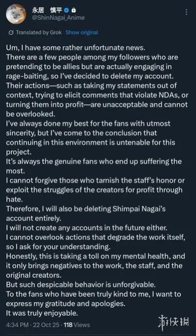 據了解,永居慎平的相關社交賬號現已全部刪除,其告別聲明被網友轉載至Reddit平台。在這份聲明中,永居指出部分粉絲表面上表示支持,實則頻繁進行挑釁和引戰,這種行為迫使他決定離開社交平台。他明確表示不會再註冊新賬號。