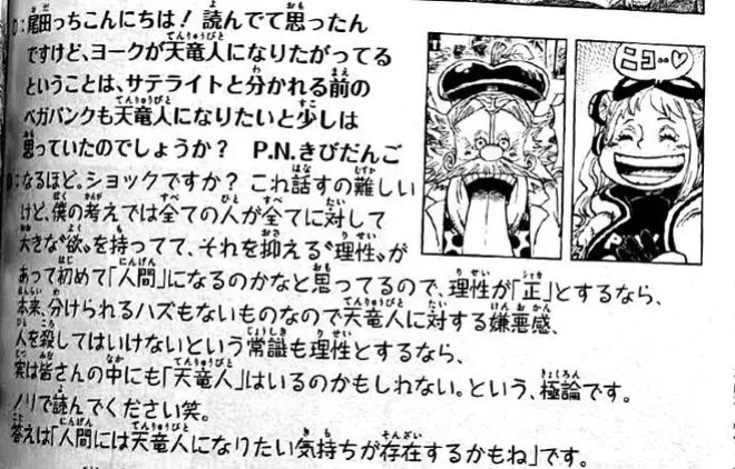 讀者:尾田親你好!看了約克想成為天龍人之後我有個想法,這是不是意味著貝加龐克本人在分出分身之前也是有一點點想成為天龍人的呢? P.N. 糯米糰子