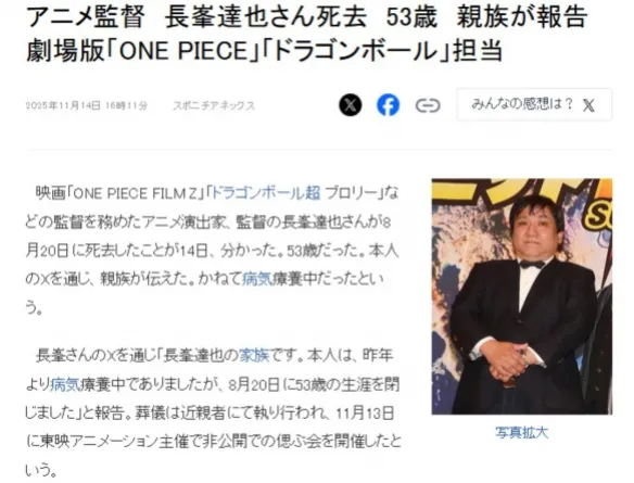 2025年8月20日,日本知名動畫導演長峯達也與世長辭,終年53歲。這一不幸的消息是由其家屬通過社交媒體賬號對外公布的。隨後,東映動畫公司於11月13日專門為他舉辦了一場非公開的追思會。