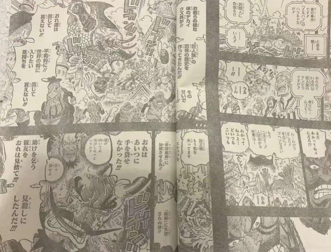 尾田大神用了一張跨頁來宣布神之谷事件徹底結束了!分別出現了兩個對稱框,代表卡普、羅傑、白鬍子、玲玲是同輩的。