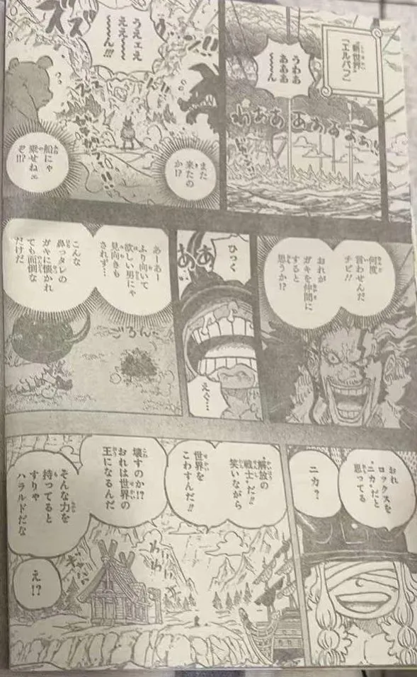 能破壞世界的力量,只有哈拉爾德才有!這裡可能暗示了艾爾巴夫有尼卡形態惡魔果實。同時那神秘的大鐵錘巨人團,的確只有哈拉爾德能命令他們。