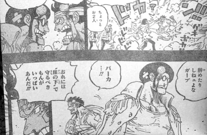 卡普表示如果連你也被黑化了,我肯定會幹掉你的。卡普憤怒到不願意跟他說話了!而卡普也不會因此而離開海軍,因為底層人還需要他來保護,而不是戰國這群人去保護他們。