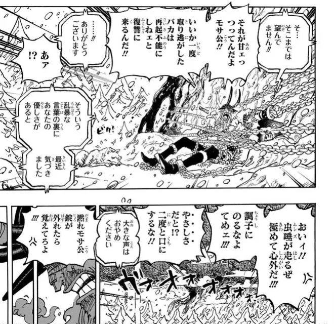 為什麼這麼說呢!因為哈拉爾德對尼普頓說「為你毛茸茸的女兒乾杯」,原文為「モサモサ(發音為mosamosa莫薩莫薩)」,而非情報師強調的967話羅傑和尼普頓交談時用的「モジャモジャ(發音為mojyamojya)」這樣的話對比1134話,與洛基通話的人名是「モサ公」,「モサ」和1167話出現的一模一樣。