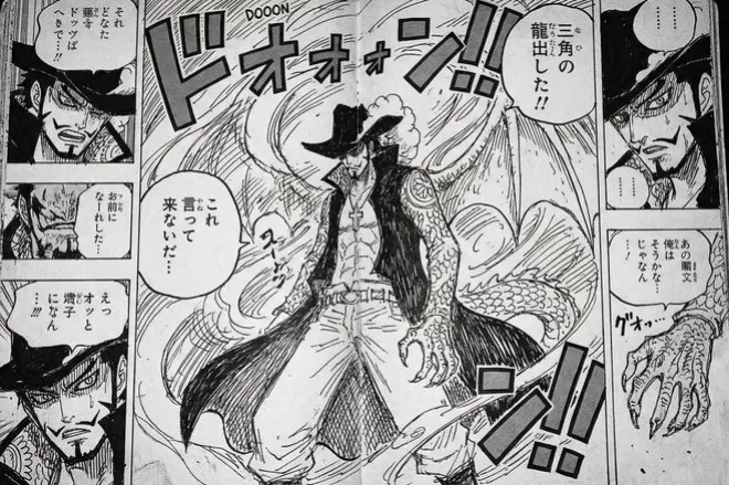 鷹眼的手臂出現了如同龍一般的鱗片,還有一對翅膀和龍尾,這代表了鷹眼所吃的惡魔果實是稀有的【西方龍形態】,跟凱多的【青龍形態】是一個級別的。也不知道凱多還能不能再次登場了,畢竟都過去好幾年了呢!