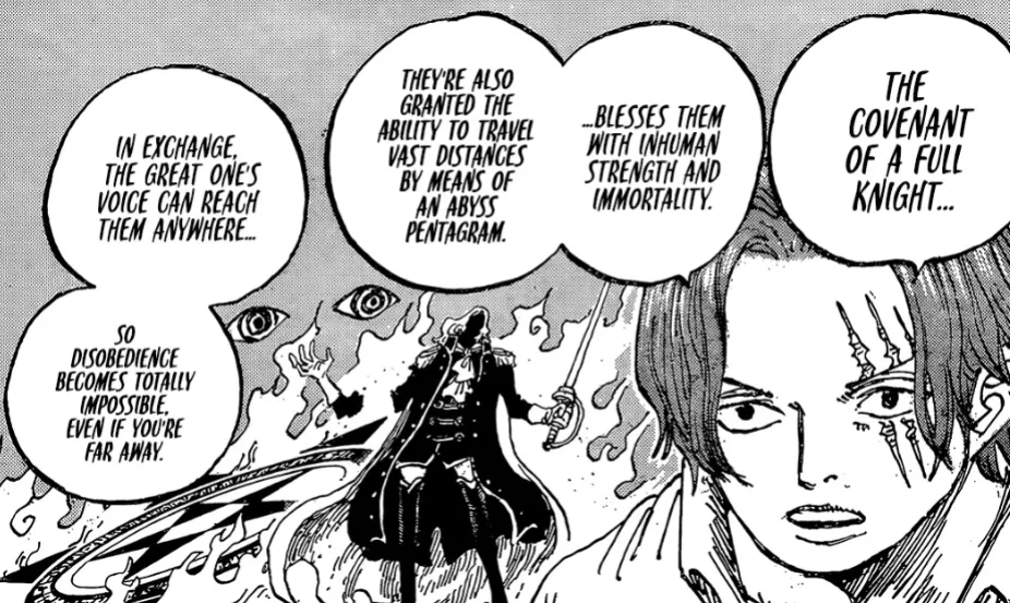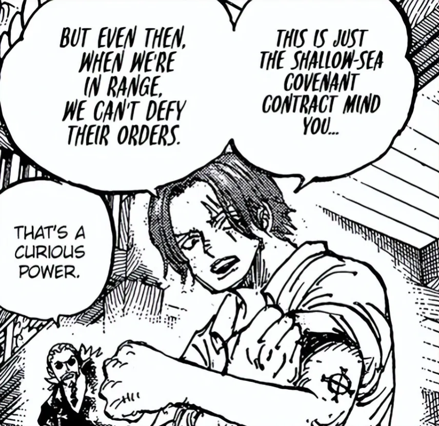 從香克斯的這些話來看,他之前被近海之王咬掉手臂應該就是為了擺脫契約的影響,因為香克斯簽的只是淺海契約,還沒擁有不死之身,只要砍掉有契約的手臂,契約就沒辦法生效。但如果簽了深海契約那就來不及了,因為那時候你就算砍了手臂,手臂也會再長出來,永遠不能擺脫契約。
