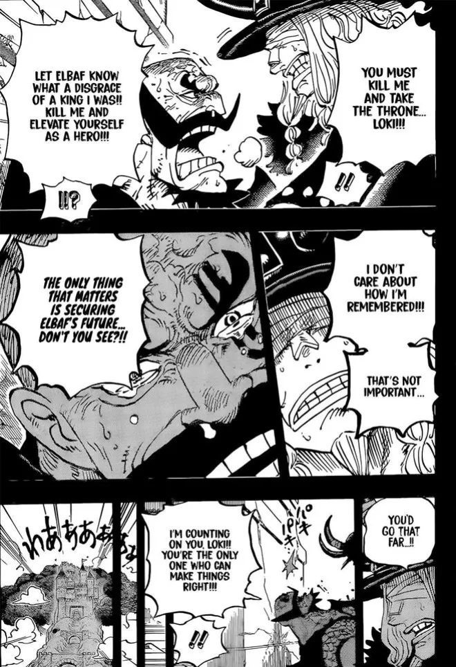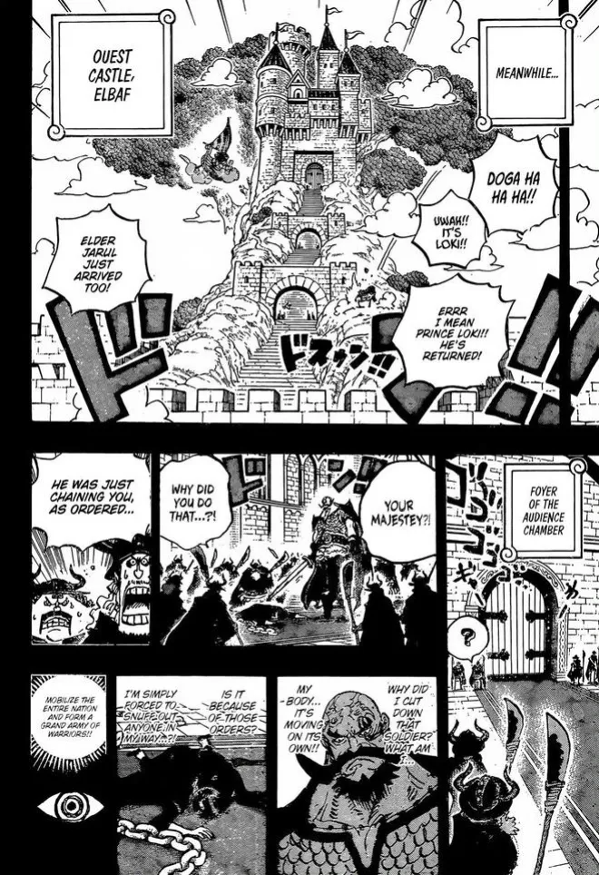 無數小兵都被一一消滅,洛基只能逃離這裡,去藏寶房間吃下傳說惡魔果實和拿下鐵雷,再來戰鬥。亞魯魯也是傷痕累累,但沒有選擇放棄!此時的伊姆用哈拉爾德說出【那顆惡魔果實是我的,你不許吃】。