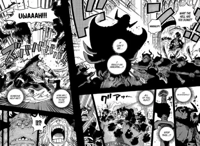伊姆控制了哈拉爾德,瞬間就秒殺了無數小兵,也知道了艾爾巴夫有傳說中的惡魔果實,可能是尼卡形態哦。士兵們都知道眼前的國王被控制了,於是都對他出手,但並沒什麽用。