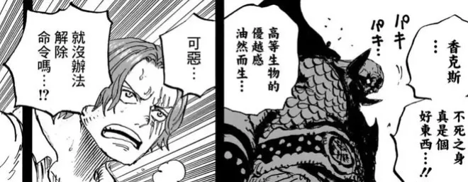 而這個詭異的不死之身也是在這一話曝光其弱點就是霸王色霸氣!賈巴告訴香克斯,必須纏繞霸王色霸氣進行不斷的攻擊,將他們打得無法再戰鬥才算是勝利,至於要如何徹底擊殺他們,尾田還是埋下伏筆,估計要用到路飛的尼卡形態果實和黑鬍子的暗暗果實。