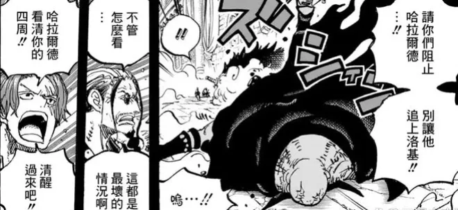在本話,賈巴和香克斯兩人都纏繞了武裝色和霸王色霸氣,然而因為哈拉爾德自身的霸氣太強大了,兩人根本破不了防,也無法傷到哈拉爾德!畢竟哈拉爾德的級別堪比洛克斯,而賈巴和香克斯並沒有【羅傑卡普】兩人的實力和霸氣,自然無法擊破哈拉爾德的霸王色霸氣。