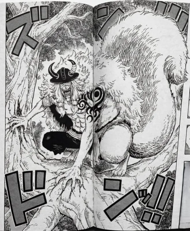 洛基將其吃下去,瞬間就變成巨大無比的怪物!那兇狠的眼神、利爪、背刺等等,都在強調這顆惡魔果實能力的強大。