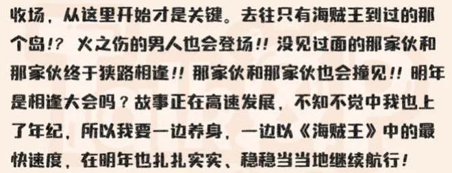 尾田大神在寄語裡透露了很多資訊,還有宿敵的決鬥等等!當然,雖然是劇透明年的故事,但有時候不一定出現,因為在連載方面可能出現【計劃趕不上變化】,畢竟尾田也年紀大了,加上前輩鳥山明的病逝,更讓他要重視自己的身體,這才是本錢啊!