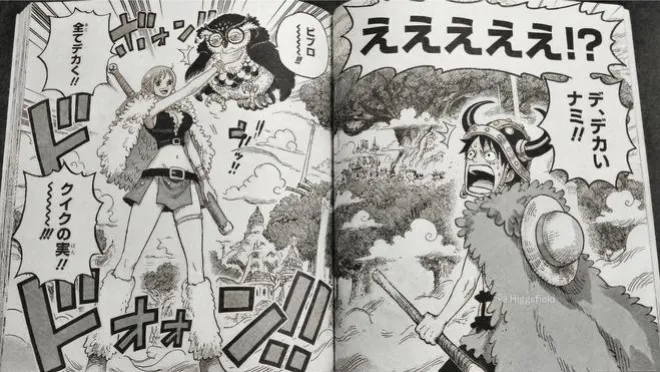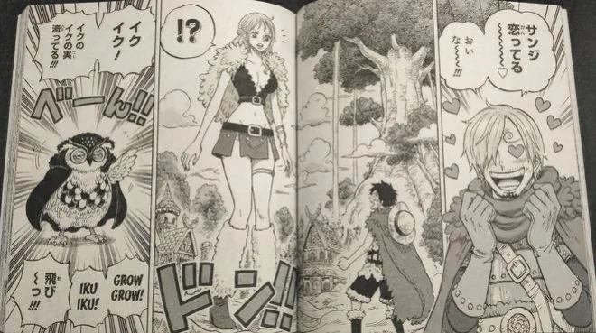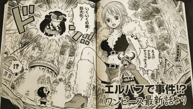 原來這一切都是海象圖書館的貓頭鷹弄的!因為它吃了一顆惡魔果實,可以將書本放大,給巨人觀看。這本來是不可以將生物變大才對,可是它完成了覺醒並領悟出這項特殊的技能,最終將娜美也變成了巨大無比的女巨人,可把山治高興壞了!