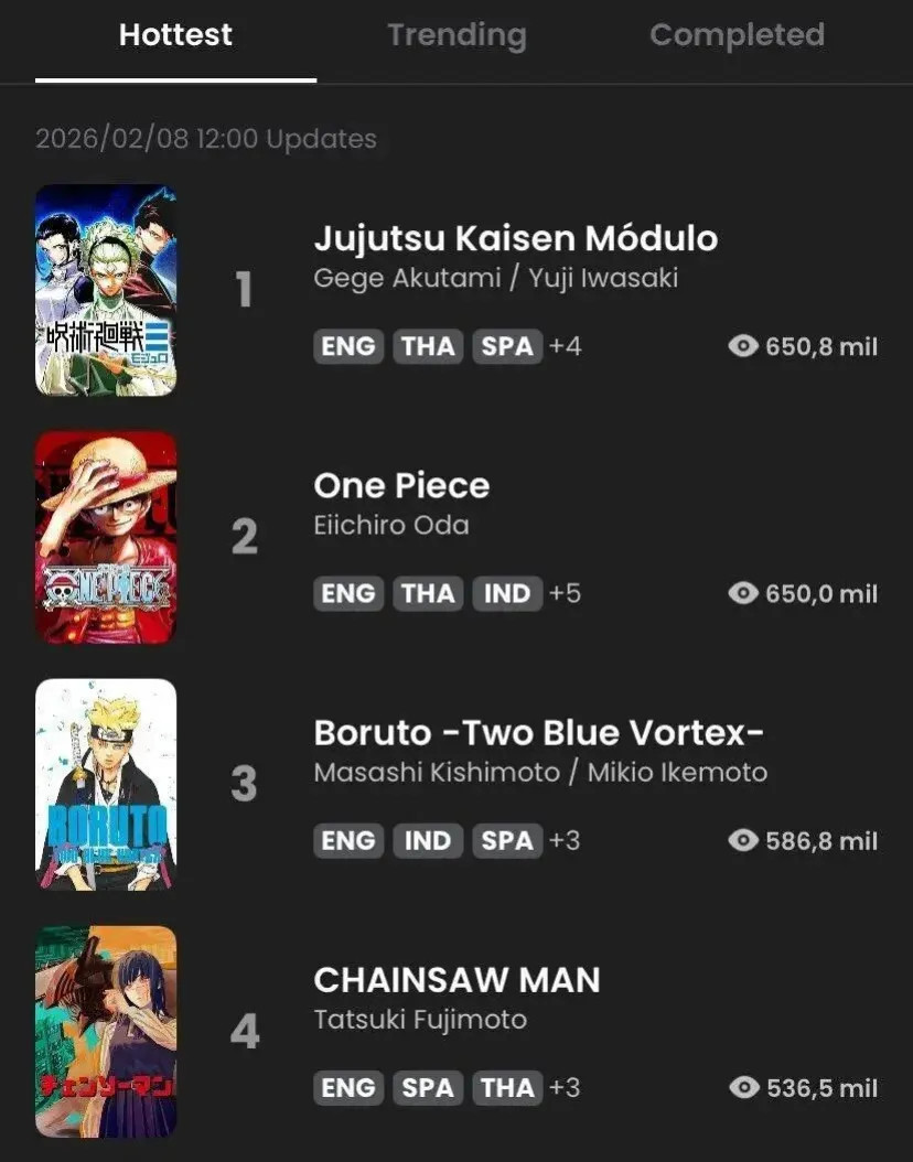 並且,不光是口碑好,續作漫畫的人氣也非常高。這不,在近期《周刊少年JUMP》官方APP的熱度榜上,《咒術迴戰》續作漫畫居然超越了《電鋸人》、《博人傳青年篇》、《海賊王》等多部人氣漫畫,直接登頂熱度榜第一。