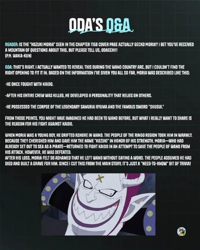 而在剛剛發布的《海賊王》114卷單行本的SBS欄目中,尾田也是首次回應了「光月莫利亞」這件事。尾田表示這個光月莫利亞的確就是後來的七武海「月光」莫利亞,而且出乎所有人意外的是,當年莫利亞和凱多交手居然不是為了搶地盤或者吞併對方,而是單純的為了保護和之國的人民。