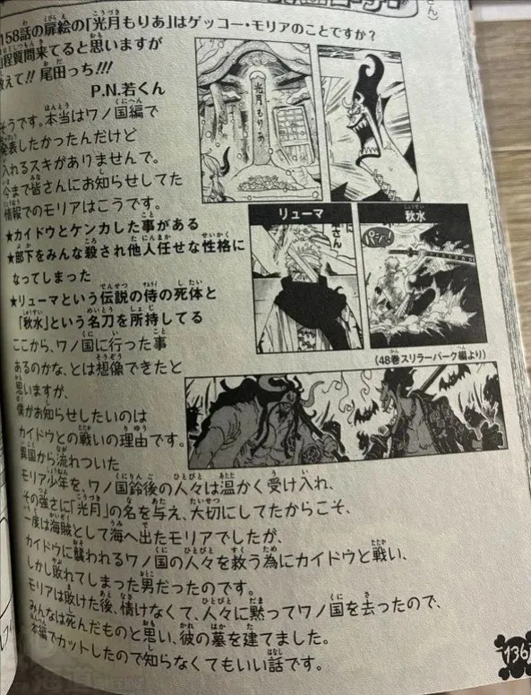 讀者:第1158話扉頁故事裡出現的「光月·莫利亞」,真的是月光·莫利亞嗎?我猜您一定已經收到很多關於這個問題的提問了,但還是請告訴我們吧,尾田老師!!(P.N.:若君)