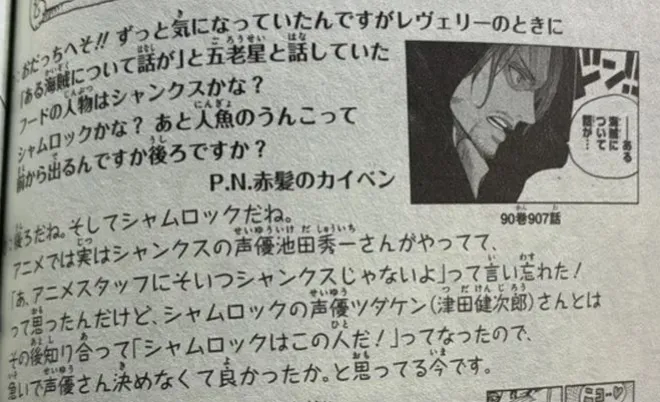 讀者:尾田親哈索!!我一直很好奇,在世界會議期間,與五老星談論「某位海賊」的那個戴兜帽的人物,是香克斯嗎?還是夏姆洛克?