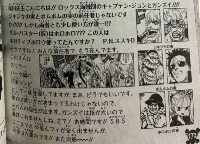 尾田:沒錯!他們都是前任能力者,而且已經死了。這三人曾在恐怖三桅帆船篇作為「將軍殭屍」登場,不過其實也沒什麼大不了的。能力並沒有固定的使用方式,使用者的個性會體現在能力上。因為甘孜手指很粗,他沒辦法像Mr.5那樣挖鼻屎來做炸彈(笑)。好了,時間到了!!本卷的SBS就到這裡!!路飛在這一卷完全沒有登場,不過下一卷會大鬧一場!!我們下卷再見~~!!