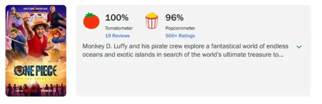 近日,據外媒playground報道,儘管此前不乏質疑之聲,認為網飛難以成功改編《海賊王》這樣的經典動漫,但該劇繼續用實力證明自己。由史蒂芬·前田和麥特·歐文斯主創的真人版《海賊王》第二季,上線後以完美的100%新鮮度在爛番茄驚艷開局,獲得影評人一致好評。此外,本作爆米花指數也高達96%,體現了觀眾對真人劇的高度認可。