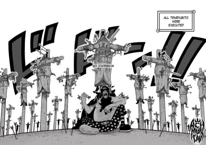 黑鬍子發動震震果實和暗暗果實摧毀了大量房屋建築,同時將那些噁心的天龍人消滅了一大半,然後將他們釘起來示眾,已報38年前神之谷事件。