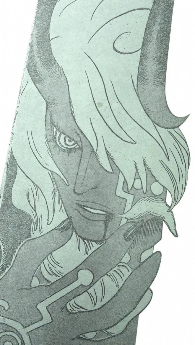 而在跨頁里我們看到了伊姆大人位於房屋頂上,霸氣擴散整個螢幕,黑雲繚繞,伊姆的真容也隨之公布了!是一位白髮、褐色皮膚、一對角,有著大量紋身的男子,顏值極高!