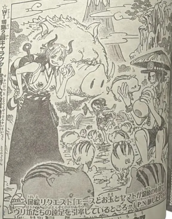 第一張是扉頁故事!並非艾斯復活了,而是尾田大神通過海米投稿的想法繪製出來的扉頁小故事,屬於獨立的。畫面是艾斯、大和、小玉三人正在跟小豬們玩耍,十分的可愛與歡樂。那麼美好的一幕啊,只可惜無法在正片漫畫中出現了啊!