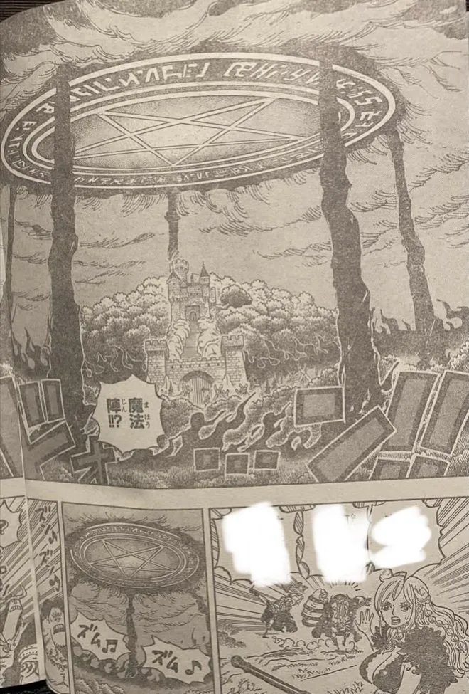 下一刻巨大的魔法陣出現在天空中,有5根黑色支柱支撐的,這就是傳說中逆五芒星陣,代表了惡魔。娜美看到這一幕後感到十分不妙,讓弗蘭奇他們前往不要過去,肯定有恐怖的傢伙要來了,跟在蛋頭島艾格赫德一樣。
