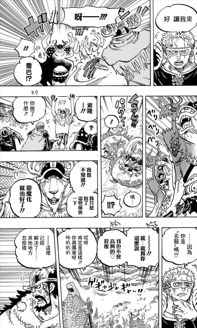 喬巴通過藍波球變身巨型怪物,一巴掌就幹掉一名惡魔巨人!瞬間讓他們的惡魔被拍走,轉化為正常狀態下的巨人戰士。這一幕讓索隆大為震驚,可喬巴自己都不知道為什麼會這樣,代表了他還沒有真正了解過他這顆惡魔果實的神奇能力,而這也跟藍波球產生的藥力有關,讓喬巴間接覺醒化了。