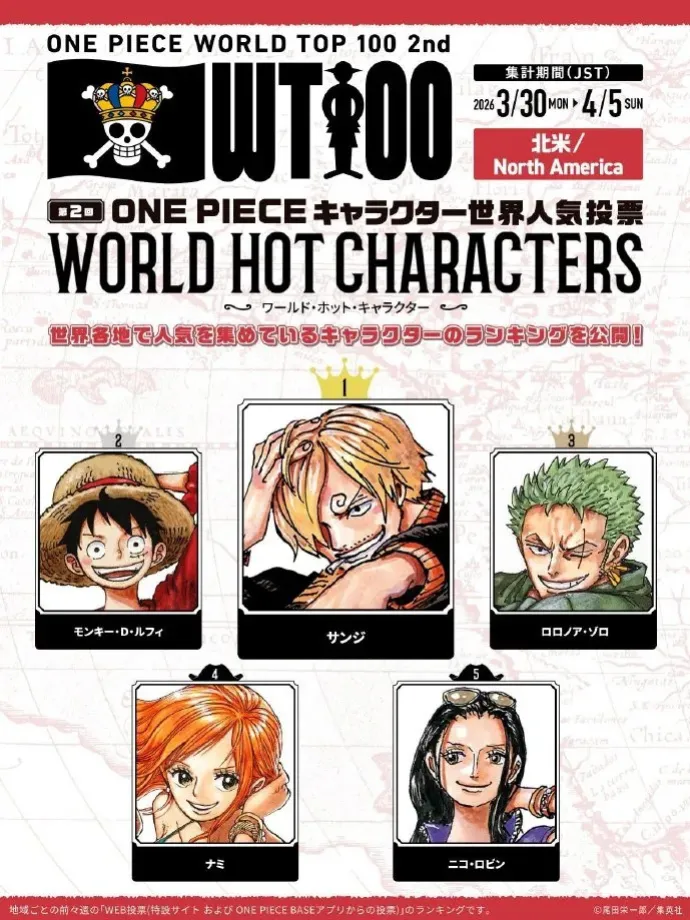北美地區:第一名:山治 第二名:路飛 第三名:索隆 第四名:娜美 第五名:羅賓