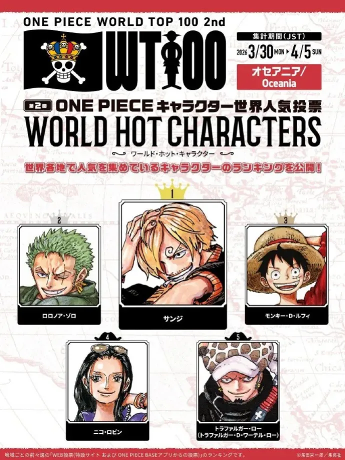 大洋洲地區:第一名:山治 第二名:索隆 第三名:路飛 第四名:羅賓 第五名:羅
