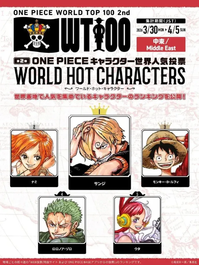 中東地區:第一名:山治 第二名:娜美 第三名:路飛 第四名:索隆 第五名:烏塔
