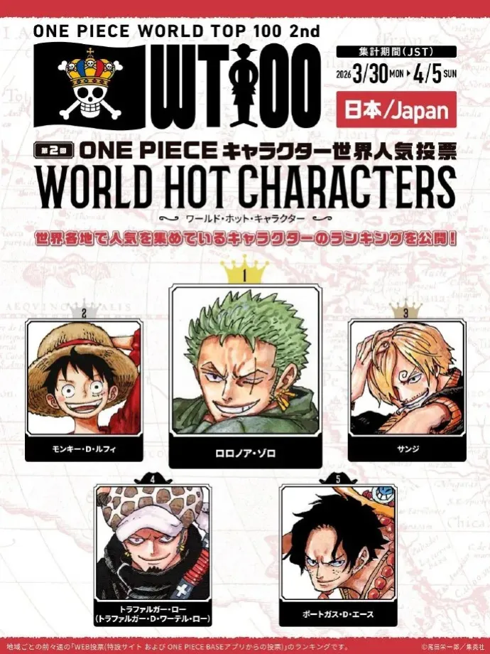 日本地區:第一名:索隆 第二名:路飛 第三名:山治 第四名:羅 第五名:艾斯