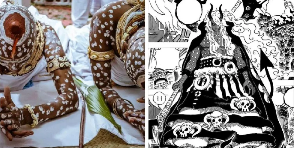 在非洲奈及利亞的約魯巴傳統宗教中,人的身體上繪製的白色點狀圖案,是儀式里召喚神祇、接引靈性護持的關鍵符號,象徵著精靈或至高神祇降臨、附身於人體。一向擅長從世界各民族民俗、宗教中取材的尾田,極有可能借鑑了這一設定,印證了這個惡魔形態的伊姆只是被附身的容器。