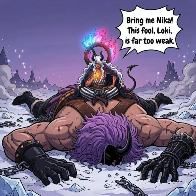 於是就出現了太陽神尼卡路飛+尼德霍格形態洛基,雙尼激戰惡魔的伊姆。這個畫面彷彿重回800多年前的一幕。也是兩個大佬跟伊姆干架,後面伊姆通過能力迷惑了那位巨人族戰神,最終導致戰神跟尼卡大打出手。
