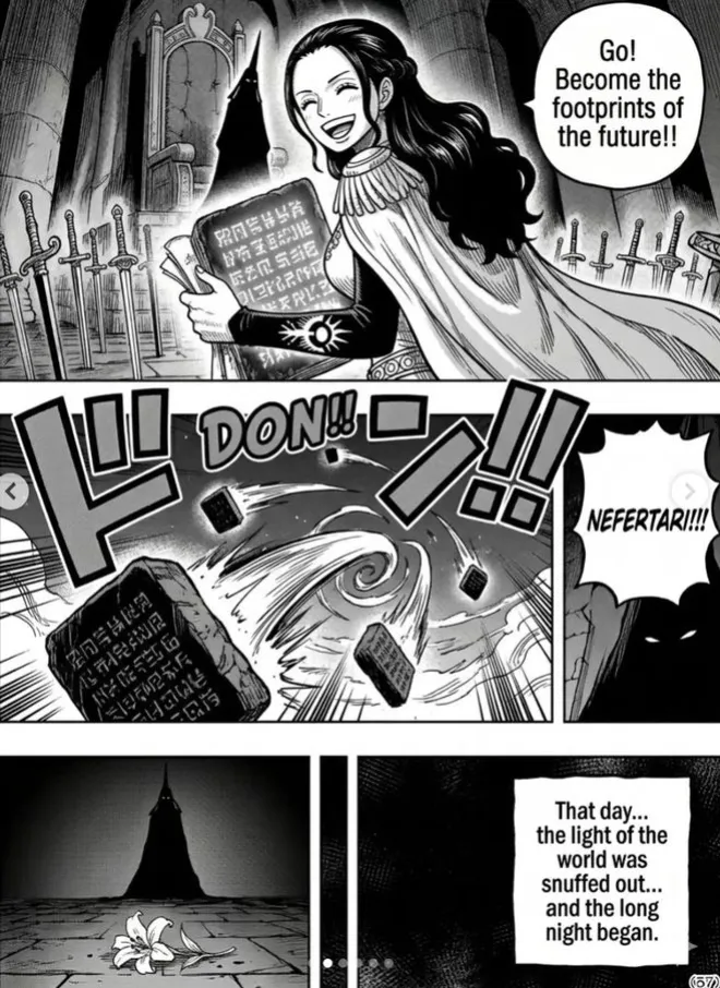 神秘的世界之王伊姆變身惡魔人獸形態,讓我們看到了他的廬山真面目!還有在聖地瑪麗喬亞出現的尾巴,重創薩博!也是通過寇布拉的話,知道了關於莉莉女王的真面目,揭曉了阿拉巴斯坦國家其實是【D之一族】的成員之一,最終讓寇布拉隕落,伊姆也才知道自己被莉莉女王給欺騙了,明白了【歷史正文】為什麼會被她給弄散了,原因就出現在這裡。
