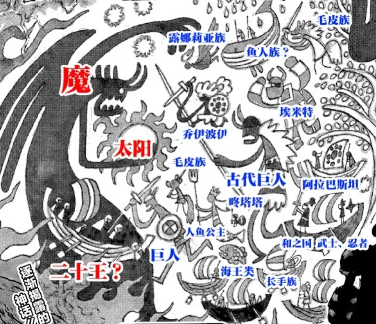 不知道大家還記不記得艾爾巴夫亞當寶樹上的巨大壁畫,壁畫的左邊有一幕是喬伊波伊和古代巨人以及露娜莉亞族、小人族等眾多種族一起對抗巨大惡魔,當時大家都以為這個巨大惡魔就是伊姆大人,畢竟伊姆大人的能力就是「惡魔」果實,還是作品的反派。